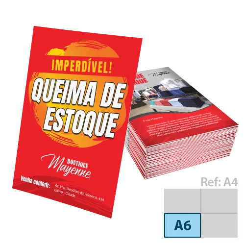 Confecção de panfletos no modelo de gráfica rápida, no papel couchê, gramatura de 90g, nos tamanhos 10x15cm, 15x21cm e 21x30cm, impressão frente, com previsão de 3 a 4 dias úteis.